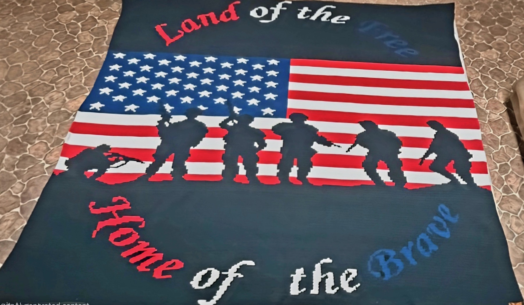 CROCHETED AMERICAN FLAG WITH SOLDIERS OVERSIZED KING BLANKET